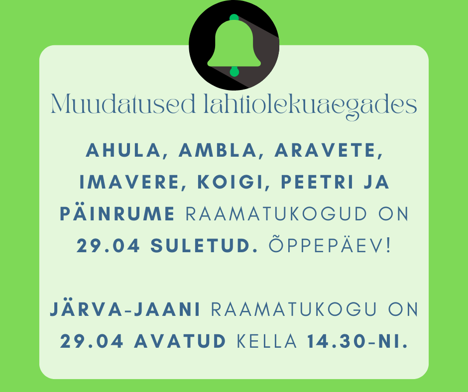 Iga kuu viimasel reedel on raamatukogud sisetöödeks suletud! 24.04